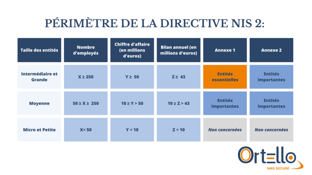 - Les entités essentielles sont les entités de l'annexe 1 de taille intermédiaire ou grande (elles comprennent au moins 250 employés ou ont un chiffre d'affaire supérieur ou égal à 50 millions d'euros ou un bilan annuel supérieur ou égal à 43 millions d'euros).