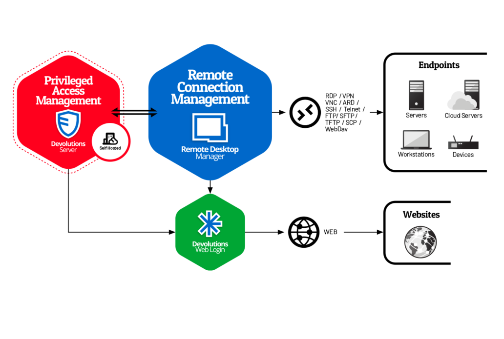 - Intégration facilitée avec l'autre produit Remote Desktop Manager (RDM)